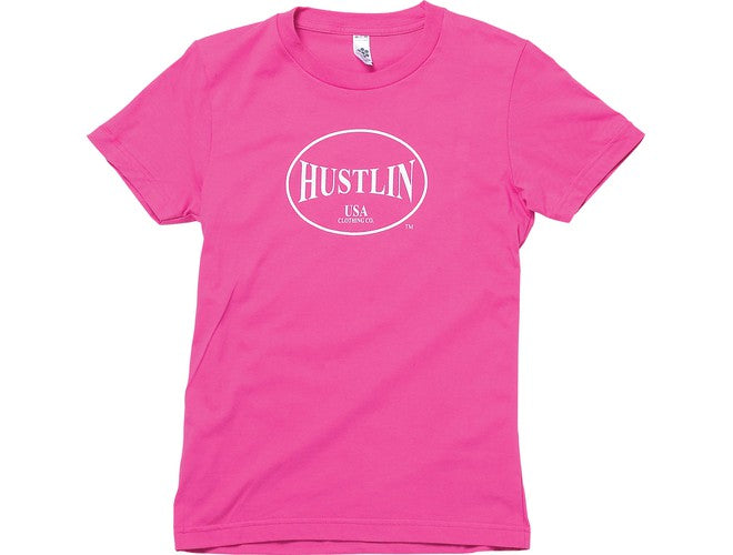 The Hustlin USA pink features a white logo on the front. The T sports short sleeves and is perfect for any woman hustler. The back of the T shirt poses the question.. Wanna Play Sum? This is available in Women's M, L, XL