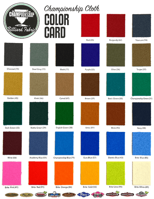 ChampionshipOriginal price $9.99 - Original price $9.99Original price$9.99$9.99 - $9.99Current price $9.99| /In stockDon't live near a Billiards.com showroom but need a cloth sample to help complete your design choice? Not a problem, order a Championship Billiard ...