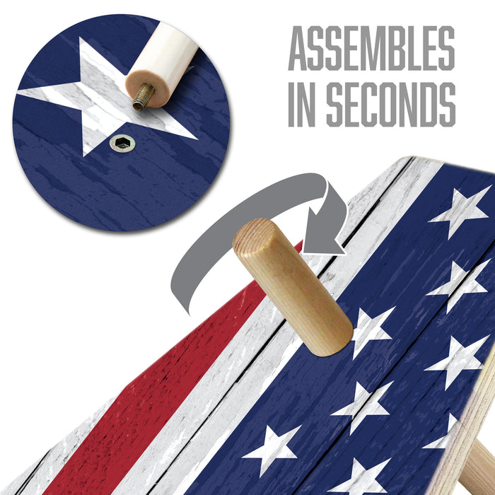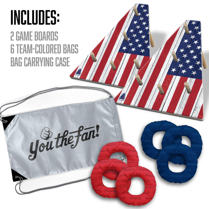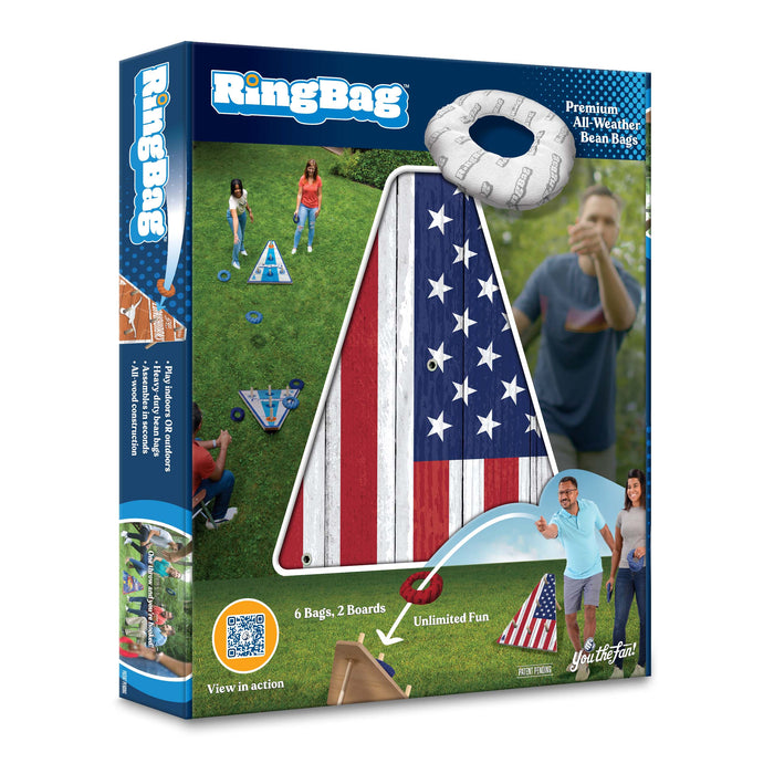 It’s a “ringer” of a good time with this classic aim game you can play anywhere! Made of durable fabric and filled with resin beads, RingBags are fun to hold and safe to toss with just enough weight to land with impact. Plus, players of all ages can represent their country with the USA Stars and Stripes! The RingBags are all-weather, team-colored fabric filled with resin beads. Includes 2 game boards with wood pegs, 6 colored RingBags, bag carrying case. Designed, machined and assembled in the USA. The perfect lawn game for your summer fun!