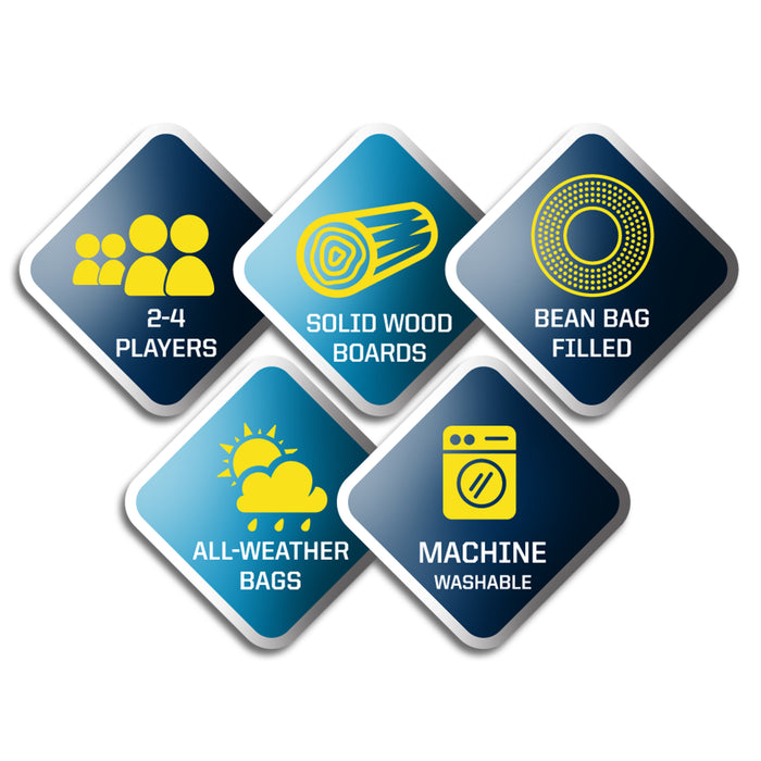 Includes 2 game boards with wood pegs, 6 team-colored RingBags, bag carrying case