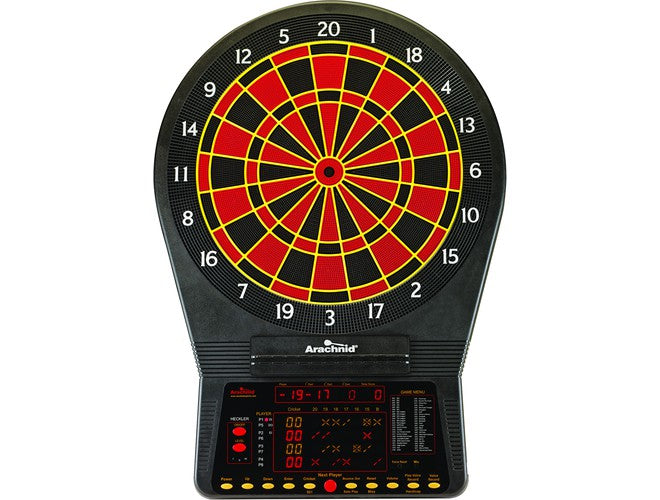 The Arachnid Cricket Pro 900 is new to the market. This board features 48 games total, 8 new. Up to 8 players with 4 players score display. The micro-thin segment dividers are sure to make smooth game play. The 900 comes with optional 3 level Heckler and an enhanced voice record prompt. This is a regulation 15 1/2" target area that features NylonTough segments for improved playability.