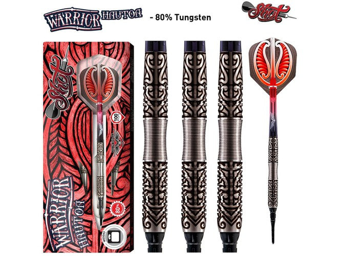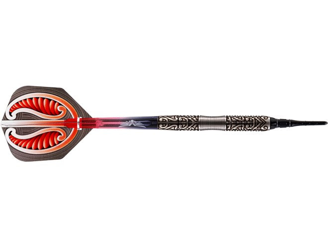 If bravery is half the battle, Hautoa - courageous and daring in Te Reo Maori - is your other half. Inspired by its elder brother, Shot Darts Warrior 3, this center weighted, 80% tungsten barrel has a slim nose with a front shark fin grip. It's followed by a scalloped band, precision placed to give you perfect center grip placement and pure confidence. Warrior Hautoa is adorned with cinder grip in a contemporary tribal tattoo design, which adds superfine traction and control in distinctive Shot Darts style. The source of your strength is also a challenge to play at your best.