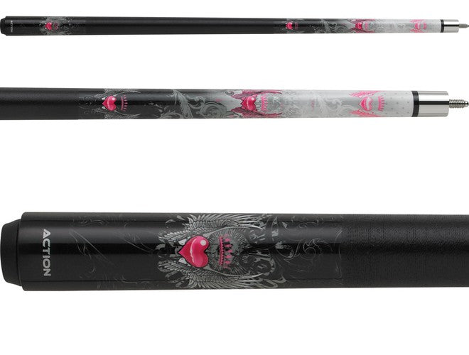The Eight Ball Mafia EBM11 features a Hard Rock Maple forearm illustrated with white, black and grey graphics with a pink heart and wings designs. The sleeve is black with a pink heart and wings design. The wrap is a solid black Irish linen.