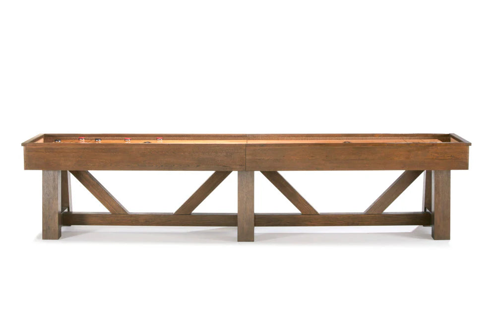 A perfect complement to the Botanic Billiard Table, the matching Botanic Shuffleboard Table completes the rustic yet contemporary aesthetic of your game room. Available in either a Dark Charcoal or Rustic Dark Brown finish, this 12' table will provide hours of enjoyment for your family and friends. This includes four black weights, four red weights, embedded abacus scoring system, board sweep and shuffleboard wax. This comes in a Dark Charcoal finish, but is also available in the Rustic Dark Brown.