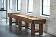 The Brunswick Canton 14' shuffleboard table expertly blends craftsmanship and rustic-industrial design elements, thanks to its aged metal turnbuckle stretchers and corner and hardware features. This comes in a Black Forest finish. This is available in a 1 piece playfield or a 2 piece playfield. The two piece playfield makes for easier navigation for difficult to reach rooms and when installed correctly, provides a seamless gameplay.