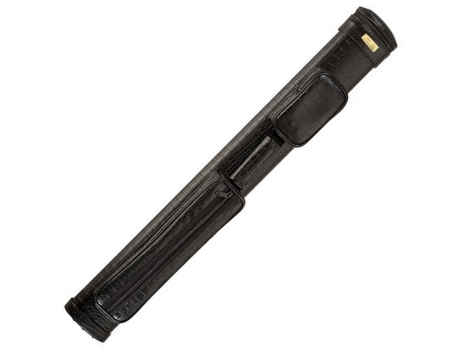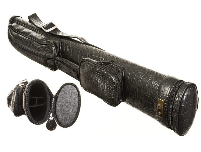 This 2 butt 2 shaft hard case is a great value. It has the look, the accessories, and functionality that every player is looking for. The texture is of a crocodile skin on the heavy duty Vinyl. The storage pockets are large enough for all of your accessories and the larger pocket fits most butt ends of jump cues.