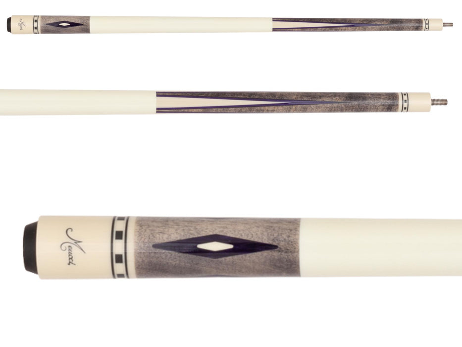 The Meucci MEEC07P is a classic design that features grey stained Maple with cream colored points outlined with purple stained Maple veneers. The sleeve has matching designs. This is a no-wrap cue that sports a white handle. This cue comes standard with the 12.5mm The Pro Shaft which sports a Ultra Skin Medium tip.