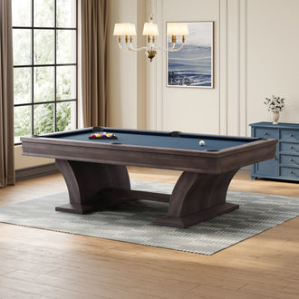 The Plank & Hide 8' Paxton Pool Table offers a modern twist on traditional design, boasting graceful arcs that provide sturdy support for the streamlined top. Constructed from Birchwood, this table showcases a beautifully stained Tobacco finish atop a stunning arched pedestal base. The integrated leather pockets not only add an air of sophistication, but also serve as a practical feature for any entertainment space or game room. This high-quality table comes equipped with a 1" 3-piece slate, ensuring durability and optimal performance.