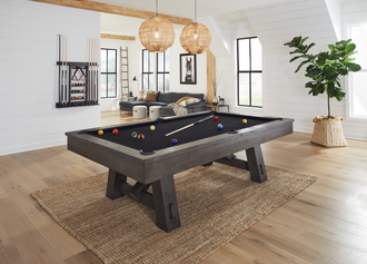 The HB Home Lucca Pool Table blends traditional and contemporary elements with a bold, minimalistic design. Crafted from Ash, Acacia, and sustainable engineered wood, this eight-foot table boasts a sleek Charcoal finish and clean, strong lines. Featuring leather drop pockets, stain-resistant felt, and metal coin rail sights, the masculine sophistication and exceptional playability of the Lucca offer endless hours of effortless enjoyment.