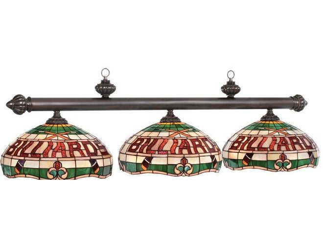 The Billiards 3 Lamp Pool Table light by Ram Gameroom is a classic design that is sure to add character to any game room. The three shades and adorned with "Billiards" with various reds, greens and white stained glass designs. The bar features an Old Brown finish and really gives this light a nice complete finish.