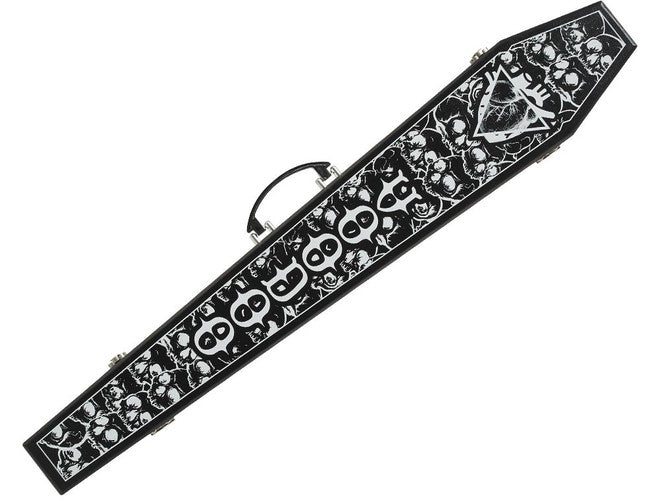 The Voodoo Coffin case is a uniquely designed case that is sure to be the talk of the pool hall. This case is shaped like a coffin & offers great protection for your cue during transportation. The design is black with white skulls, blood pulsing heart and Voodoo logo. The interior showcases a purple satin liner.