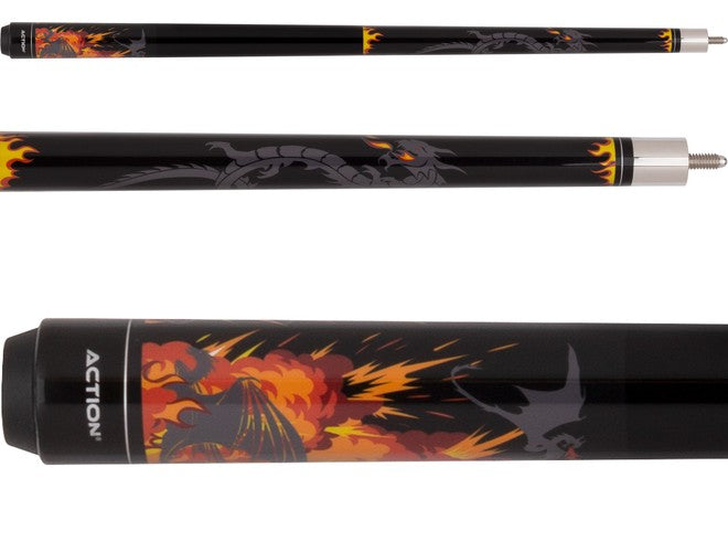 The Action Junior JR20 Dragon cue is a 48" two-piece cue that is a no-wrap design. The forearm features grey dragon and flame designs while the sleeve sports dragons and explosions. Perfect starter cue for Junior players. A 12mm LePro Tip and a 24" Hard rock maple top this cue off.