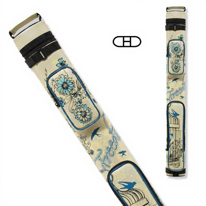 The Athena embroidered Birdcage case holds 2 Butts 2 Shafts and is a durable Vinyl case that carries your cues in style. This case features a cream vinyl with blue, black and cream birdcage designs, flowers and birds accents. Blue Freedom embroidery. Comes with two storage pockets, one small and one large. A top carrying handle and a shoulder strap make transporting it easy. This is the perfect match for any of our Athena cues!