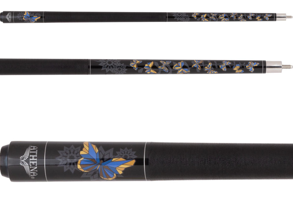 The Athena ATH59 is a black cue with blue and gold butterflies and grey flowers on the forearm and sleeve. The wrap is solid black Irish linen for a non-slip grip.