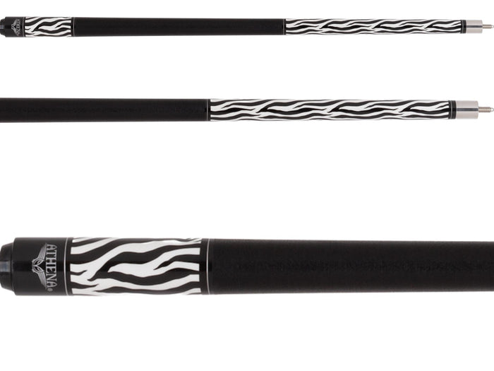 The Athena ATH60 is a black cue with Zebra print designs with silver rings on the forearm and sleeve. The wrap is solid black Irish linen for a non-slip grip.