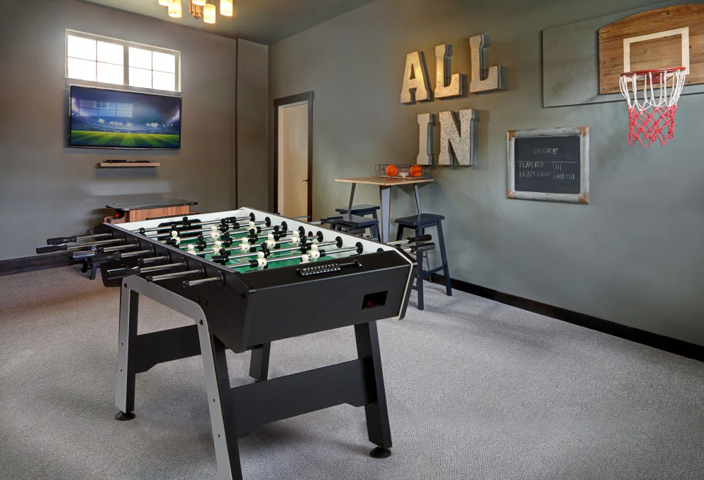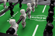 Experience the luxury and sophistication of the Brunswick Corner Kick Foosball. Our table boasts a single-man goalie and counterbalanced players with machine screws for smooth gameplay. The sleek green play field is adorned with graphics, and two balls and additional players are included. The steel chrome-plated hollow rods and doubled sided HPL MDF play area ensure durability, while the white HPL lined play area and MDF with Matte Black and Silver PVC structure exude elegance. Elevate your game with our Foosball table.