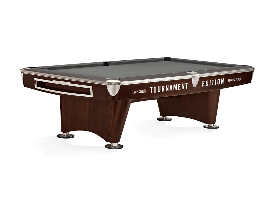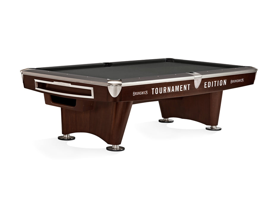 The Gold Crown VI Tournament 9' continues Brunswick's tradition of excellence as the newest edition of the legendary table series. It features a familiar design with modern styling. The new low-profile leg base and hidden stretcher provide a streamlined appearance while the angular canted leg emphasizes the clean lines. The table also features new corner and rail castings in a brushed nickel finish for a sleek high-end aesthetic.