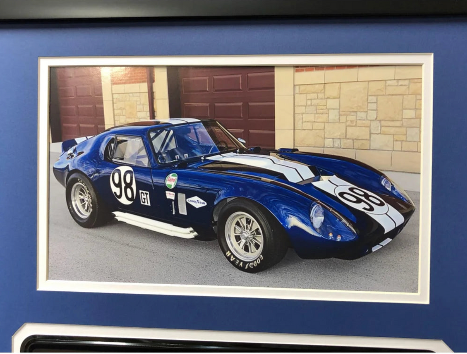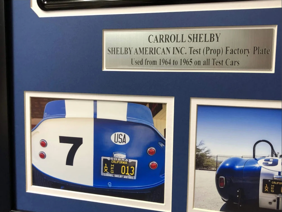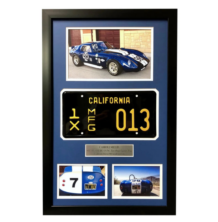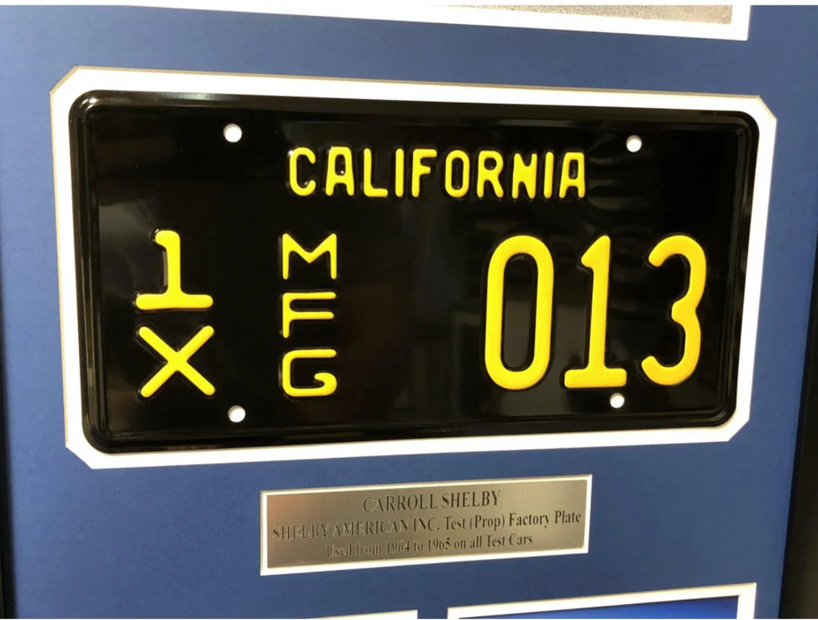 Looking for the next big thing to add to your memorabilia collection? Carroll Shelby Ford COBRA Daytona Coupe framed licensed plate collage!! This is a must-have for the man cave as the collage features a replica license plate that is 100% PERCENT SCREEN ACCURATE to Ford vs. Ferrari the movie! In addition, this plate is an exact replica of what SHELBY AMERICAN INC. used for all their test cars from the early 60s to mid 60s.