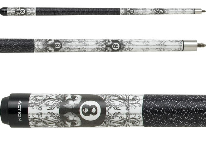 The 8 Ball by Action is a gray cue that features three 8 Ball logos with