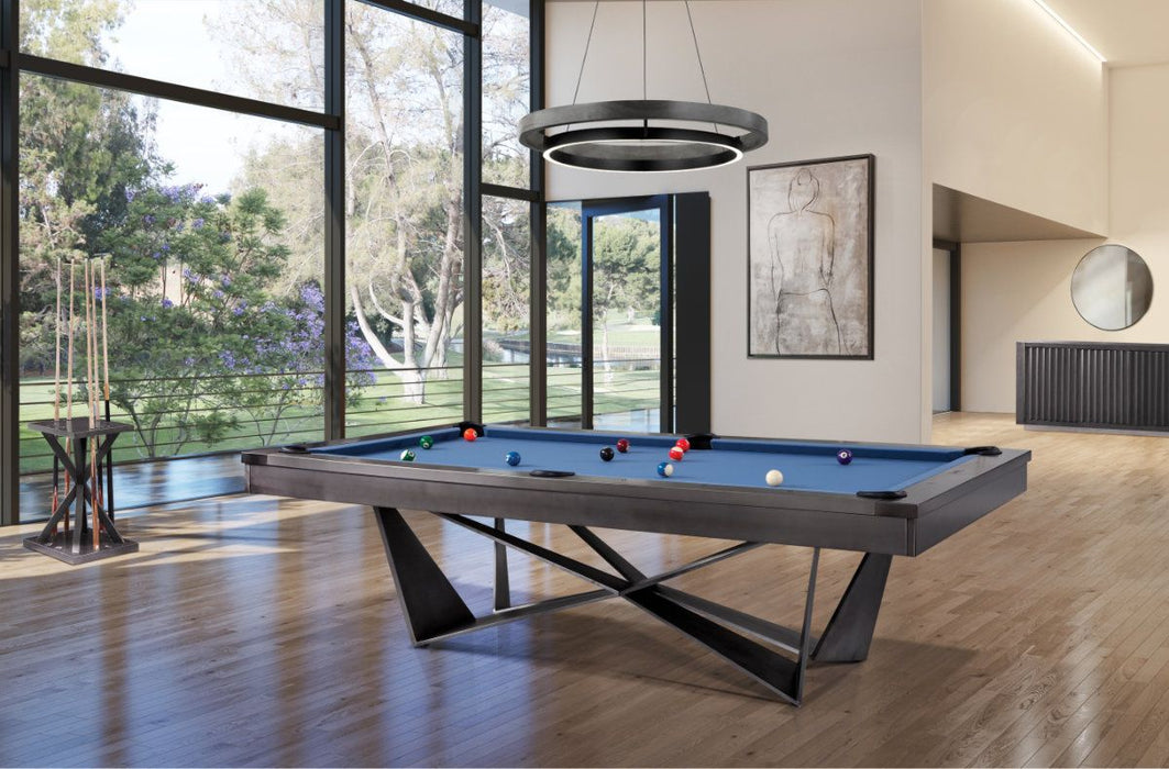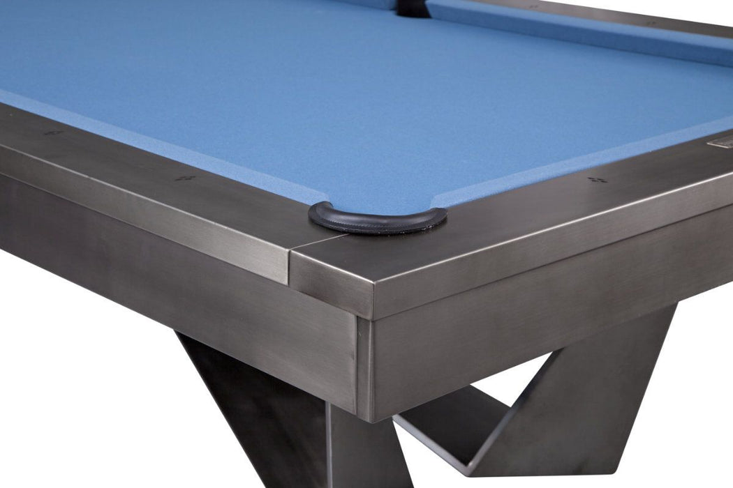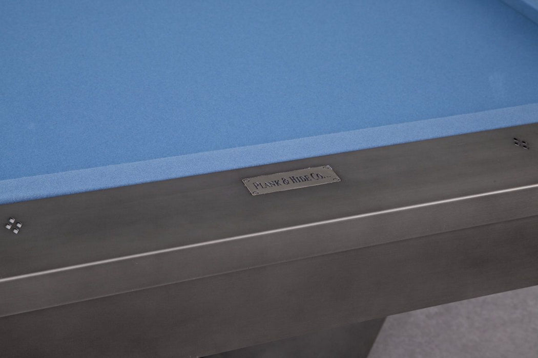 The Plank & Hide Industrial Series 8' Essex Pool Table is a stunning example of modern industrial design. Its angled open-air legs create an illusion of weightlessness, while sleek steel rails, concealed pockets, and diamond laser-etched sights ensure optimal gameplay. The Essex comes in a Gunmetal Grey finish, steel frame & base topped off with stainless steel Rail Caps and Aprons.