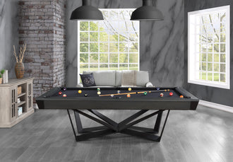 Indulge in the ultimate gaming experience from the comfort of your own home with the Alton Pool Table by HB Home. Featuring a sleek and contemporary design with open geometric legs, this luxurious table is hand-finished in a stunning smoke color. Crafted with precision using kiln-dried solid Maple, Birch veneers, Acacia, and other hardwoods, this masterful piece is equipped for professional game play with three-piece certified slate and K66 natural cushion rubber on the rails for an authentic and consistent rebound. The Teflon-coated felt is spill-resistant and accompanied by custom drop pockets made of leather, providing a quiet and polished gameplay. Every detail of this elegant and functional pool table is designed to command attention and elevate any space it occupies.