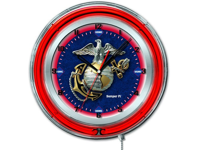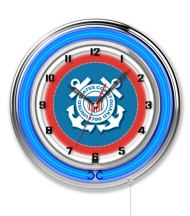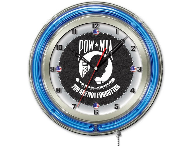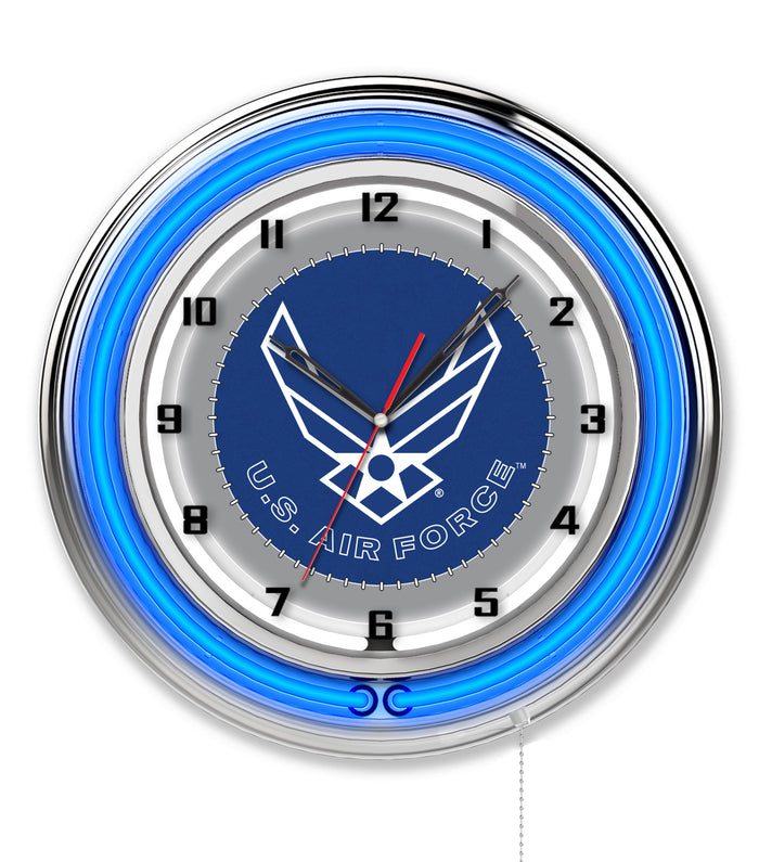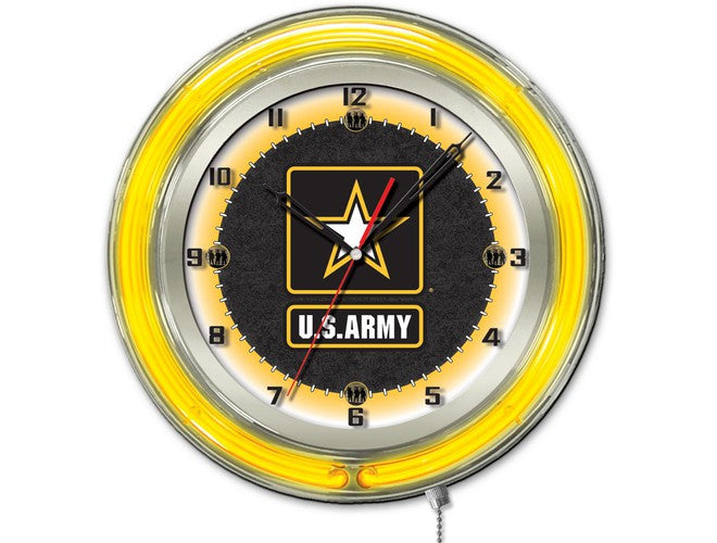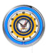 These Military Licensed Neon Clocks are the perfect way to show your American pride. These 19" Neon clocks feature a chrome casing and a branch specific neon ring. The clock face is lit up by a brilliant white inner neon ring. Turn this clock on and off easily with a pull chain at the bottom of the clock. Accurate quartz movement is powered by a single, AA battery (not included). These clocks are made in the USA!