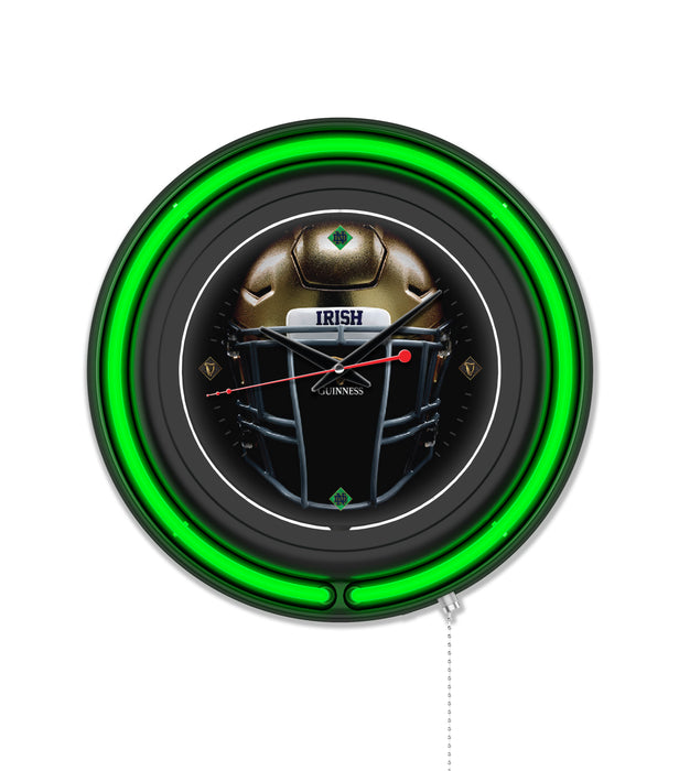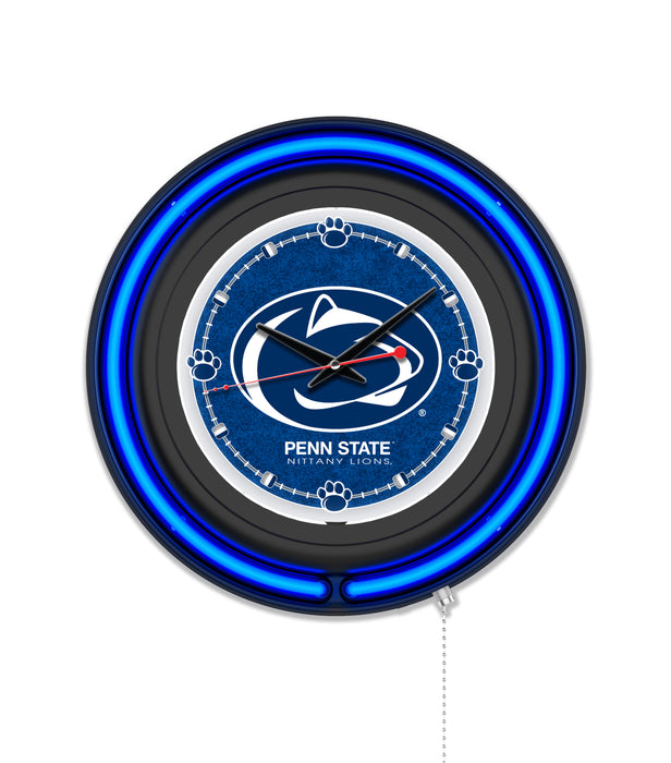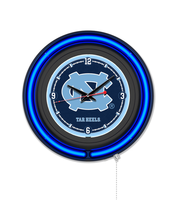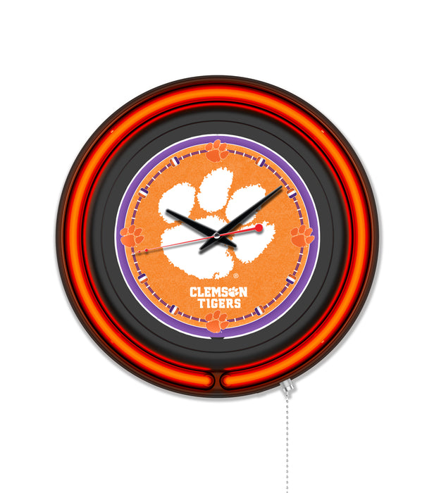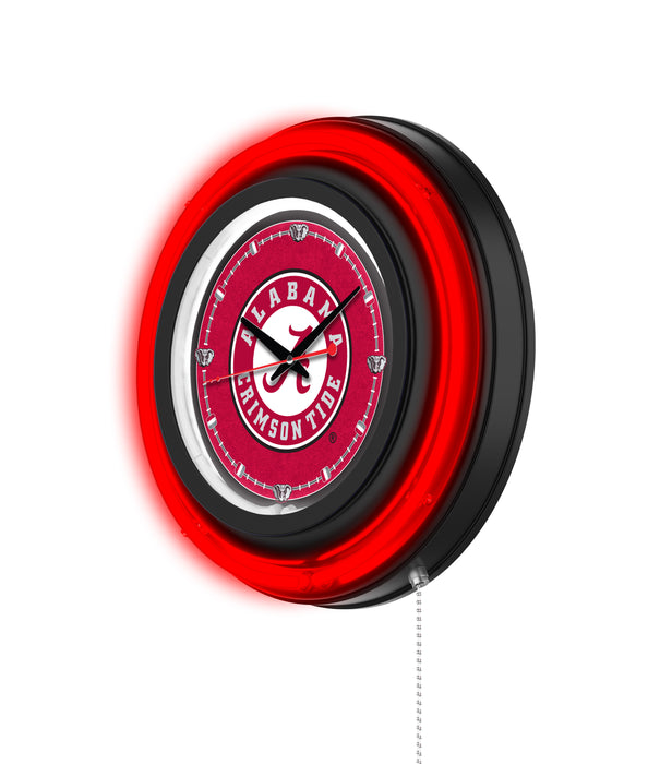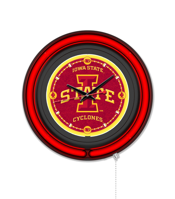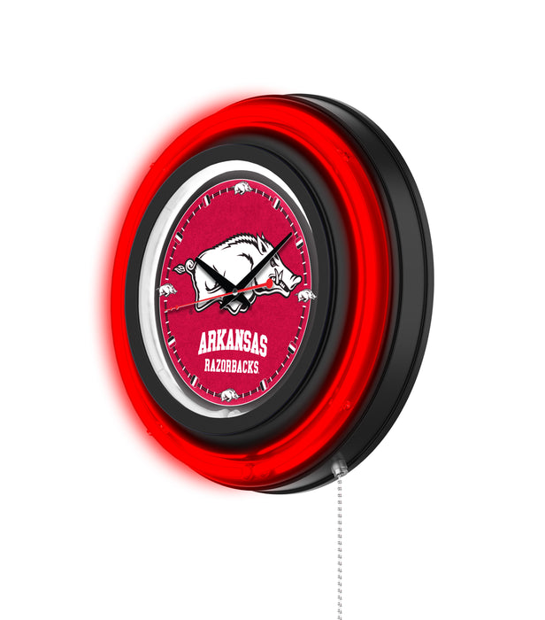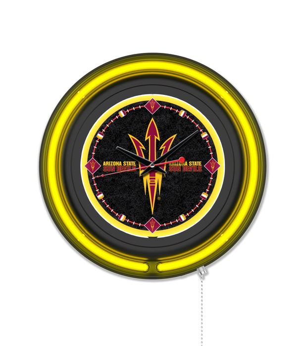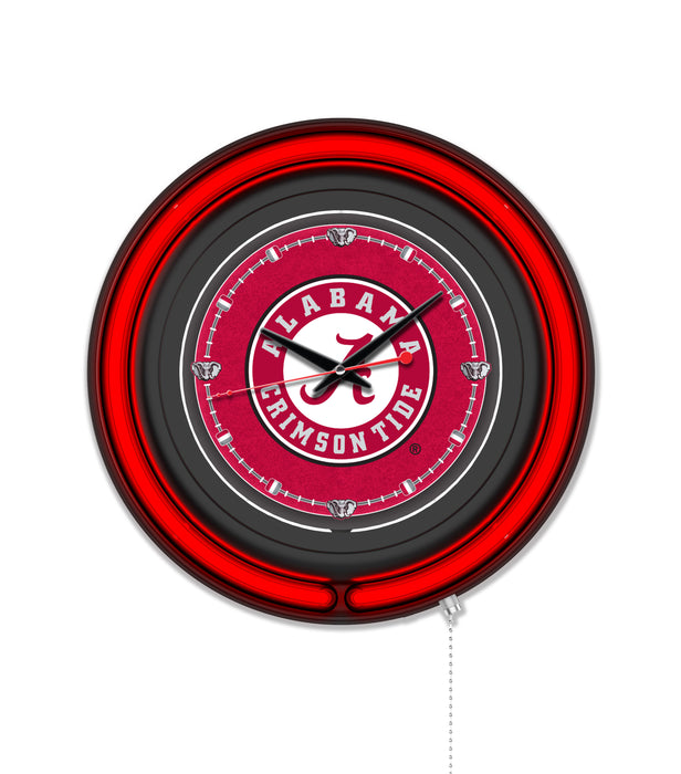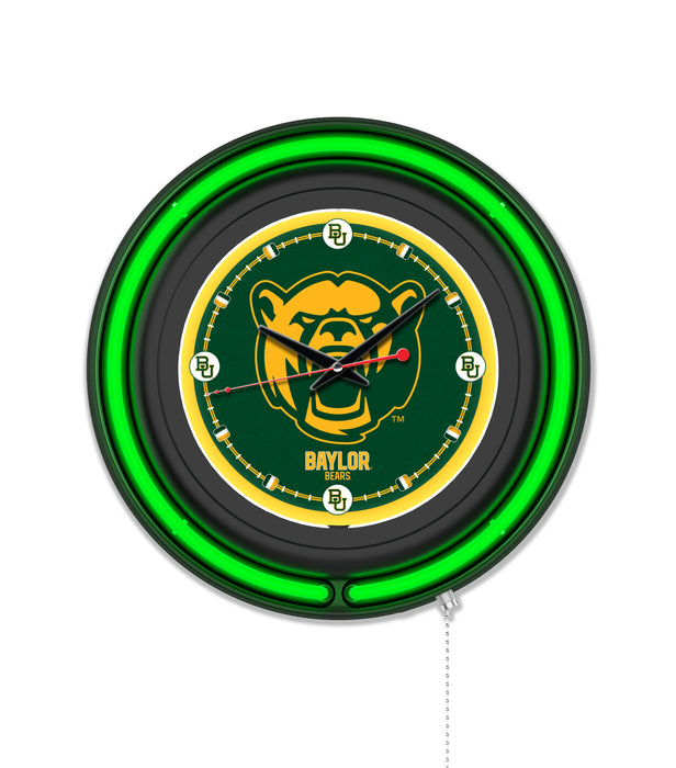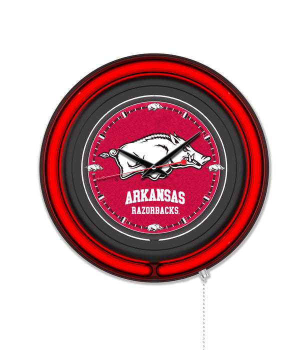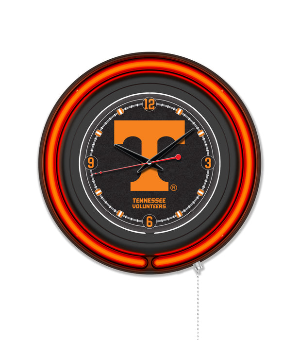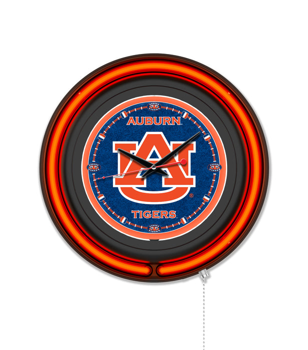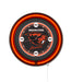 These NCAA Licensed Neon Clocks are the perfect way to show your school spirit in your game room. These 15" Neon clocks feature a new Black casing and a team specific neon ring. The clock face is lit up by a brilliant white inner neon ring. Turn this clock on and off easily with a pull chain at the bottom of the clock. Accurate quartz movement is powered by a single, AA battery (not included). These clocks are made in the USA!