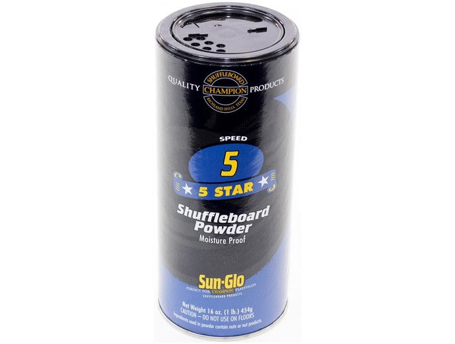 Sun-Glo Speed 5 Shuffleboard Powder, formerly 5 Star Shuffleboard Wax, is for a medium to fast game, and ideal for 14-ft. to 22-ft shuffleboard tables. Another popular powder for both professional and social players. This powder gives players a comfortable game with optimum speed and control. Use the Sun-Glo cleaner and silicone spray to keep your game consistent and competitive, and your table clean. One pound can.
