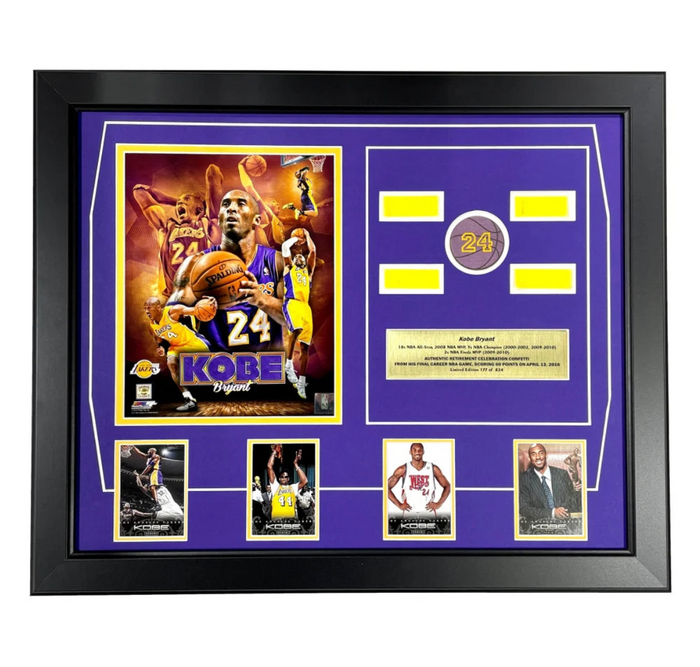 This piece comes professionally museum quality custom framed in team color matting, a black frame, an 8" x 10" photo, a gold nameplate depicting information about some of Kobe's career accolades and the confetti, a plexiglass display with 4 authentic Kobe trading cards. This frame measures approximately 23" x 19" in size.