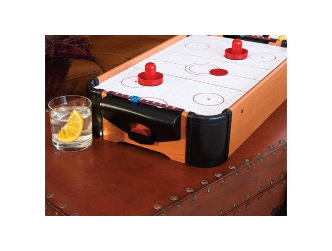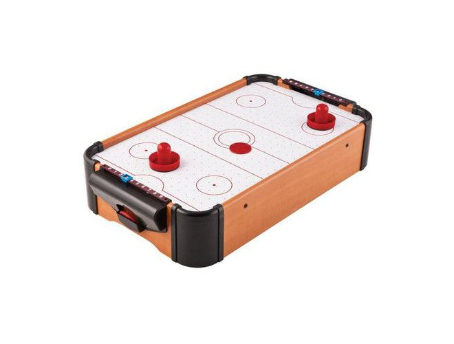 The Mainstreet Classic Table Top Air Powered Hockey is sure to give your friends and family hours of fun. This portable table is perfect anywhere on a flat surface. The small size doesn’t take away any features that you’ve come to expect from arcade style tables like a fully powered motor to provide the air cushion or a slide scorer to keep track of your wins. The Table Top Air Hockey Mini Game Set includes all of the crucial accessories you need to play, sized perfectly for the miniature table: two pucks and two pushers.