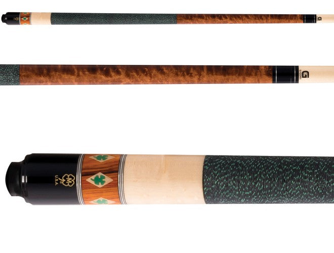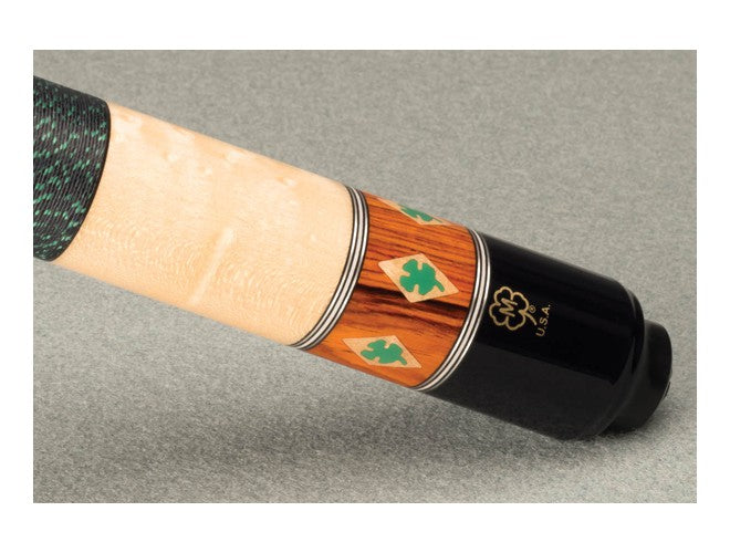 The McDermott G331 has a dark American Cherry stained Birdseye Maple forearm. The sleeve is a natural birdseye maple with 6 green urethane clover inlays inside 6 birdseye maple diamonds. The inlays are bordered with slim silver rings matching the rings on each end of the joint collar.