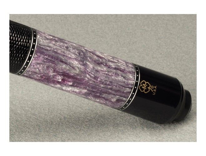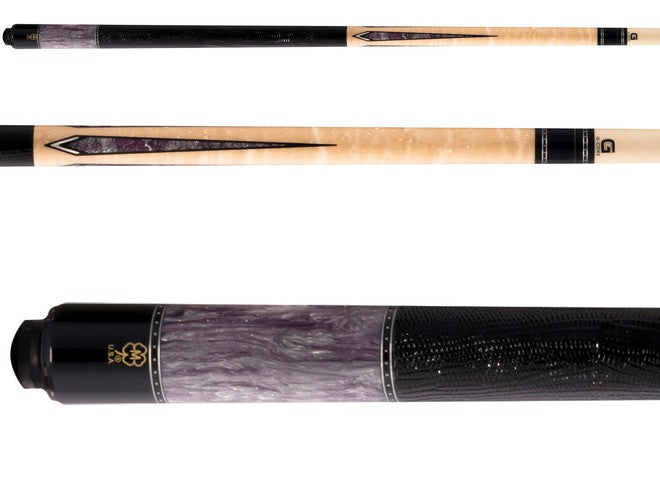 The McDermott G430 features a unique new design called "Violet Storm" which combines Silver speck with a Purple and White pearl sleeve & points. The wrap is Lizard-Embossed leather and provides non-slip grip. The G-Core Low Deflection shaft comes standard on the G430 and is equipped with a Navigator Black tip. All McDermott cues come with a lifetime warranty that includes warpage.