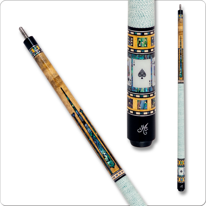 The Meucci Casino Series are some of the most sought after cues on the market. The Casino 6 definitely gives off Las Vegas Casino vibes. This cue is Antique stained Maple and features a Paua Shell sleeve with a 4-Card Royal Flush Bordered by Paua Shell Dice Set in Black.