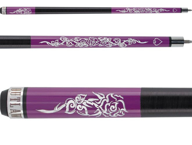 The Outlaw 44 features Purple painted maple forearm and sleeve with white painted Roses and Vines. The wrap is black stacked leather and is sure to provide a non-slip grip. The shaft is made of Hard Rock Maple and comes equipped with a 13mm, 7 layered vacuum sealed proprietary boar skin tip.