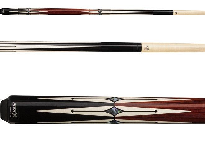 The HXTE1 is a modern design that features a black stained Birdseye Maple forearm and butt with floating split graphic lacewood points. This cue is a wrapless design. Comes standard with the PureX® 12.75mm HXT Low Deflection Technology Shaft and a Kamui black soft tip. This cue comes with a lifetime warranty that includes warpage.