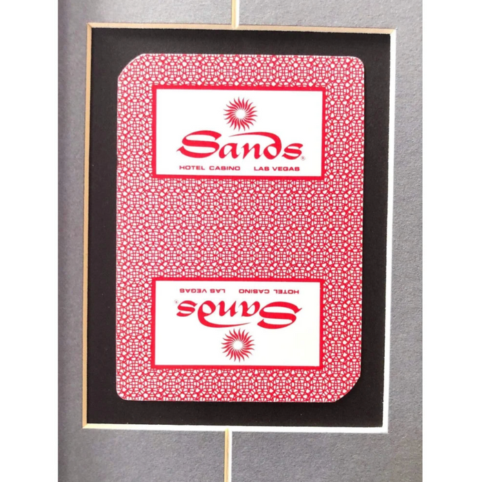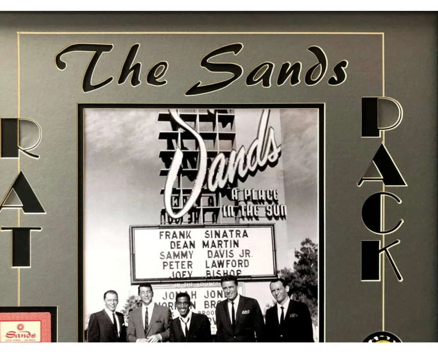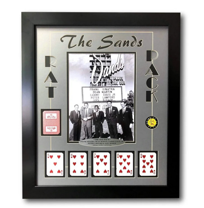 Rat Pack "Sands Hotel" Las Vegas Framed Playing Cards Collage!! This collage features actual cards from the iconic demolished Las Vegas hotel where the iconic group played their best years!! Pictured in the photo in front of the Sands sign is Frank, Dean, Sammy, Peter & Joey! You will receive a random assortment of cards all showing a winning 5 card poker hand! In addition, this piece comes with a fantasy poker chip of the hotel which is what some used to look like back in the day!! This is a great item for fans of the Rat Pack & must have for all game rooms, man caves, lady lairs & office!!