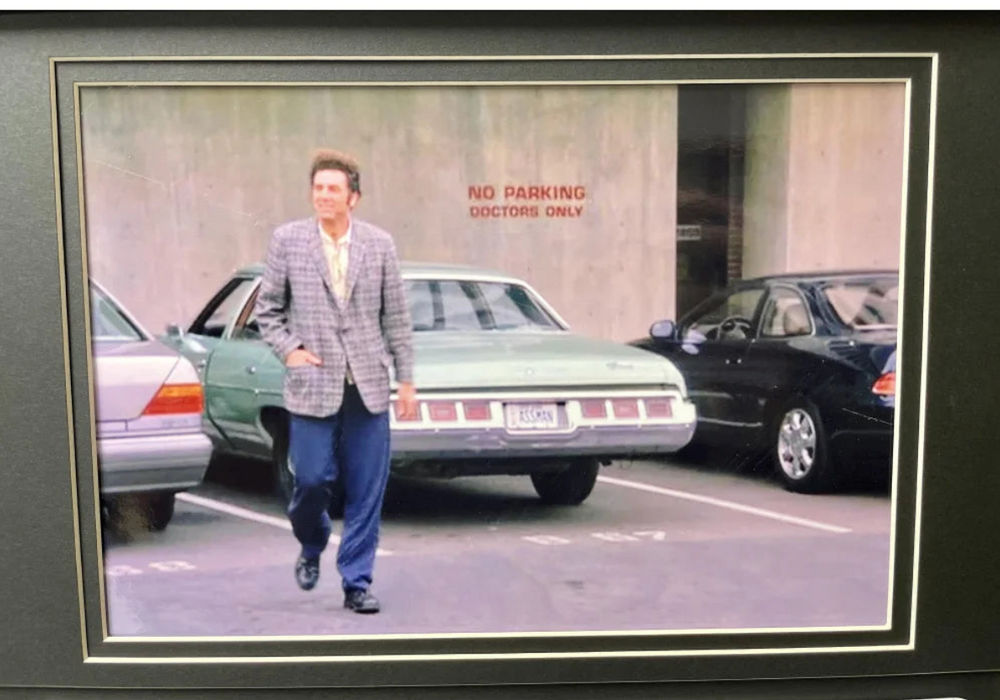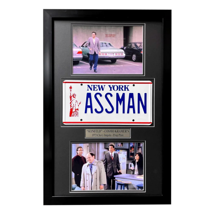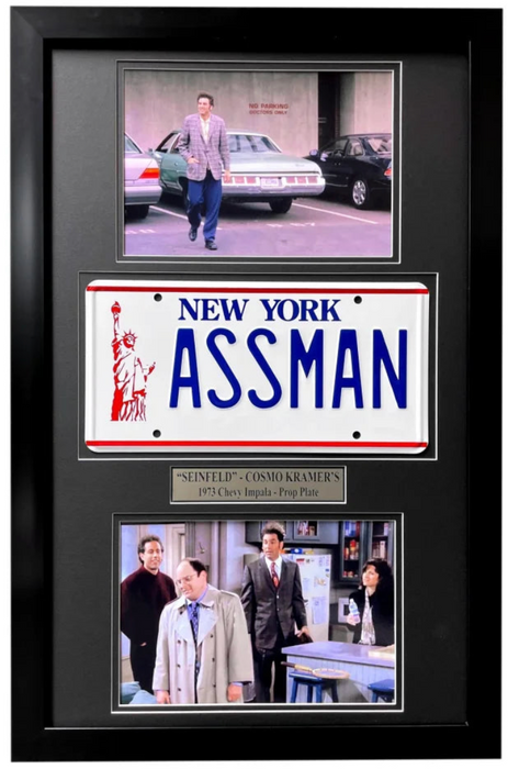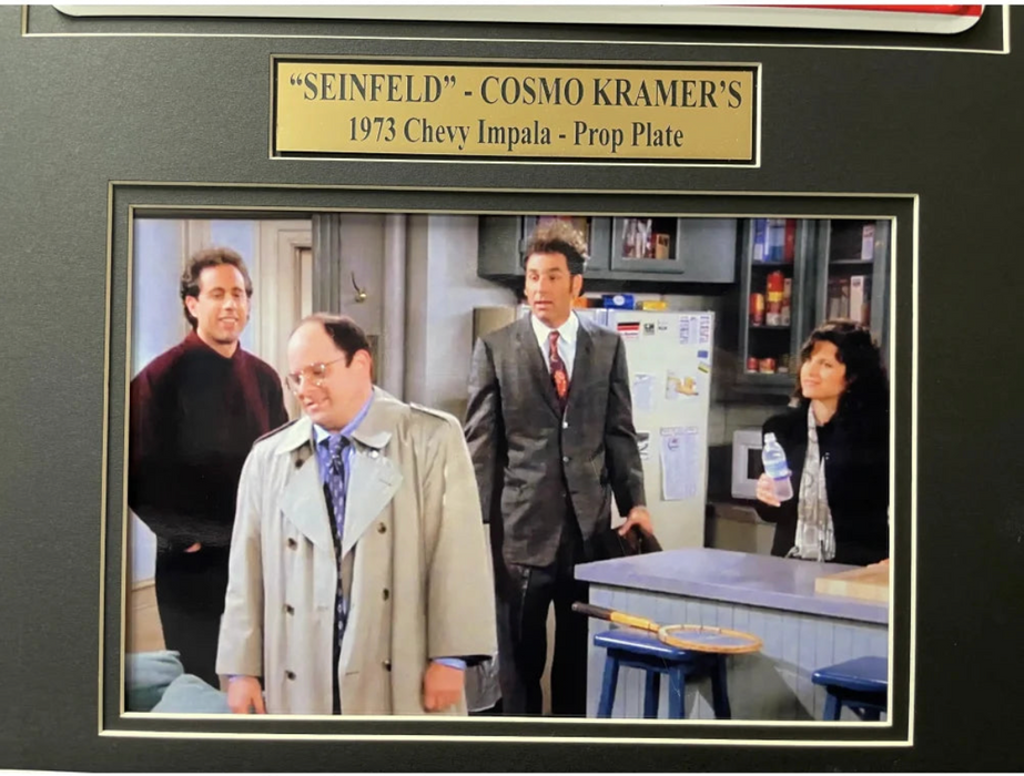Looking for the next big thing to add to your memorabilia collection or game room? "Seinfeld" framed licensed plate collage!! This is a must-have for the fan-cave as the collage features the license plate as seen on Cosmo Kraemer's 1973 Chevy Impala!! The replica metal license plate is a full-size license plate you would see on any vehicle on the road and measures approx 12" x 6" in size. Please note this license plate is not screen-used just a replica of the one you would see in the show. If you are a big fan of this show and are looking to put a great piece on your wall, then this is it!