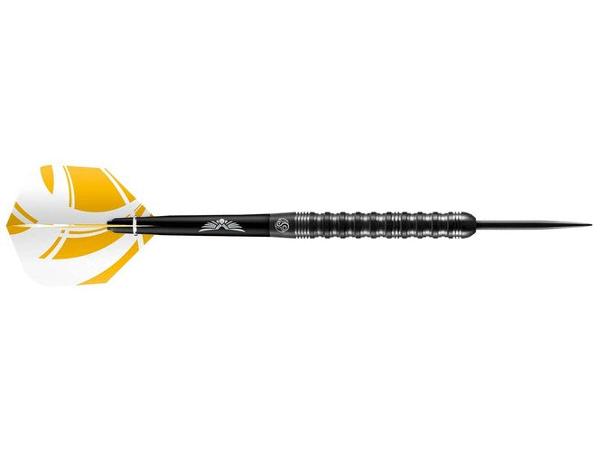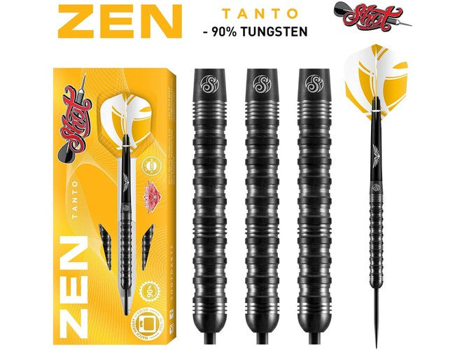 The Zen Tanto steel tip dart is a straight barrel design with a pyramid grip from the nose to the tail enrobed in sleek black titanium. This is a center weighted dart that is ideal for those who want a less aggressive feel with the Pyramid grip design.