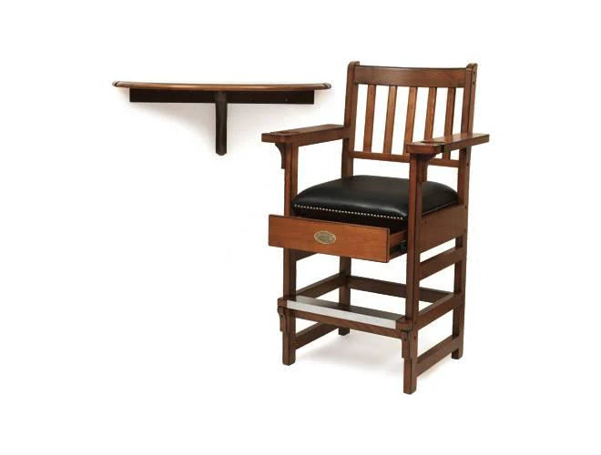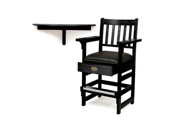 Enhance your billiards room with the Spencer Marston Half-Moon Table and Deluxe Chair Set. This set includes a half-moon, wall-mounted pub-style table and a deluxe spectator chair featuring a storage drawer and durable vinyl seat. With various finishes available, you can easily match this set to your existing Spencer Marston furniture or pool table for an authentic pub atmosphere.