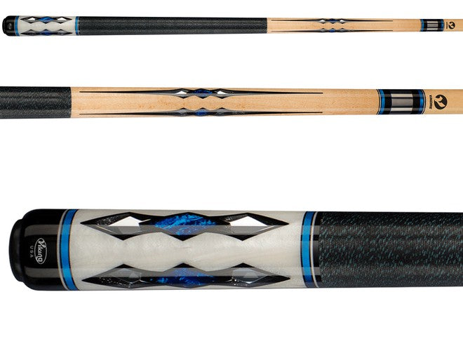 The Viking Motore MT0404 is one of the best looking cues on the market. The combination of Mirror and Black inlays and Blue Premium Pearl Inlays really set this cue apart. The forearm stands out on its own with a Khaki stained Birdseye Maple adorned with multiple Mirror, Black and Blue pearl inlays. All Viking cues come with a lifetime warranty that includes warpage.