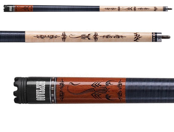 The Viper Desperado Sting cue features a Scorpion design on the Acacia sleeve. The forearm is built with Maple and has several scorpion designs. A Le Pro leather tip ensures a solid grip on the ball, reducing miscues, a Pro Taper gives a consistent and comfortable feel across your stroke, and a 100% genuine leather wrap reduces vibration and provides unparalleled grip. Also included is a built-in removable scuffer that is on the bumper of the cue.