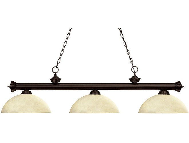 The Z-lite Riviera Collection features the Domed Golden Mottle 3 shade pool table light. This light starts with a bronze light bar and is paired with domed Golden Mottle glass shades. This beautiful light is the perfect way to add a bit of class to your game room. Included is 72 inches of chain per side is included to ensure a perfect hanging height.