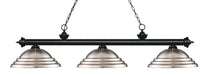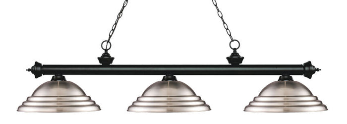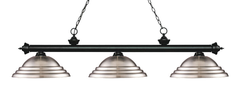 This striking three light fixture exudes an air of elegance and tradition. The stunning Matte Black finish is perfectly complemented by the sophisticated Stepped Brushed Nickel Metal shades, making it a timeless addition to any space in your home, whether it be the game room or any other room in need of a touch of luxury.