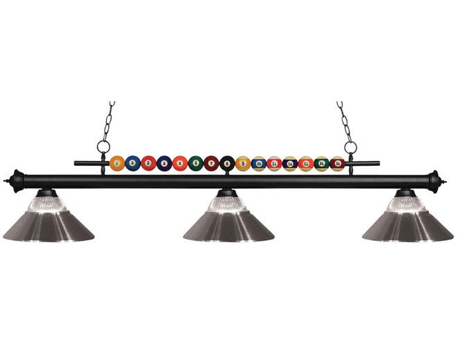 The Shark Collection by Z-lite features pool ball motifs that really sets this line apart from all. This light has a Matte Black finish bar and is paired with clear ribbed glass and brushed nickel metal shades. This comes with 72 inches of chain per side is included to ensure the perfect hanging height.